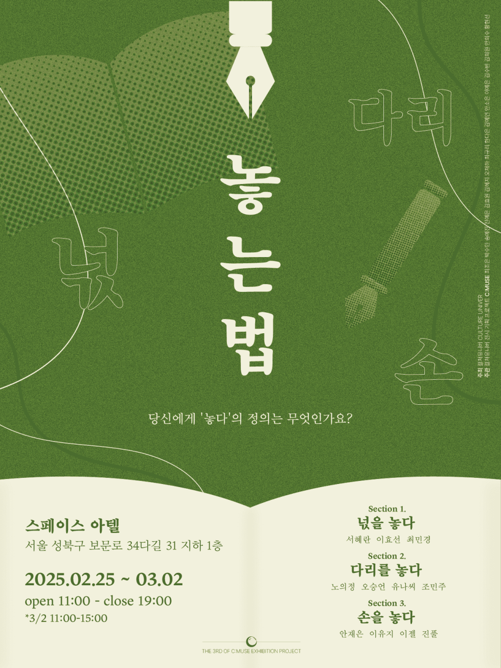 대학생 전시 기획 프로젝트 C:MUSE 세 번째 전시, '놓는법' (성북구 스페이스 아텔) 페이지 정보 작성자 610 조회 2,880회 작성일 25-01-15 21:12 본문 추천 0 관련링크 https://www.instagram.com/c_muse_u/ 1000회 연결 https://tumblbug.com/cmuse3 827회 연결 목록 이전글 OPEN CALL: 2025 월간 openARTs 레지던시 글로컬 네트워크 참여작가 모집 25.06.05 다음글 수원이목1차(A4BL) 대방디에트르 아파트 신축공사 현장 미술장식품 설치 용역 모집 공모 24.11.01