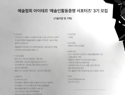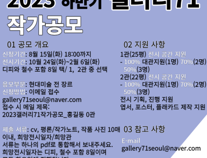 2023 갤러리71 작가공모 ■ 공모부문: 현대미술 전 장르■ 공모자격: 나이, 학력, 전공 무관■ 접수마감: 2023년 8월 15일(화) 18:00 도착분에 한함 (시간 엄수) ■ 전시기간: 10월 24일(화) ~ 2월 6일(화) (해당 기간 중 디피와 철수를 포함 8일 택)■ 제출서류: CV, 평론/작가노트, 작품 이미지 10매 이내(캡션 필수), 전시 희망 일자 3개, 희망 관> 모든 서류는 하나의 pdf로 통합 제출> 갤러리 1관, 2관 중 선택 기재 (전시장 …