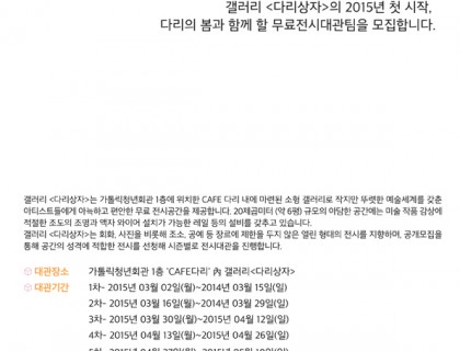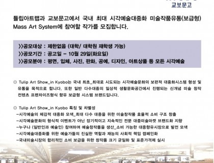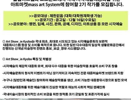 이번 "Art Audition 2016" (gw엔터테인먼트 주최) 국내 복합장르 및 개별 전문분야 예술대중화를 목표로 진행되는 차세대 아티스트 발굴 오디션 시스템입니다.이번 시즌.1은 국내 예술문화장르 중 “대중음악과 시각예술” 장르에 한하여 시작합니다.그리고, 추 후 시즌.2에서는 다양한 장르의 확장 및 아트 콜라보레이션을 선보일 예정입니다.대상>>대상 : 제한없음>>분야 : 시각예술(평면, 입체, 영상, 사진, 공예, 디자인 등) / 대중 음악(싱어송라이터)>>주최 : 지웍스…