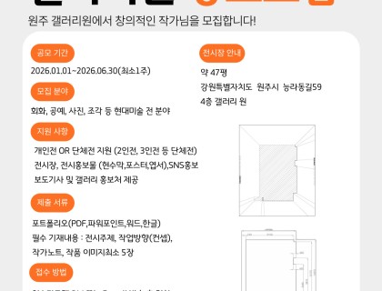 2026 Hedwig Gallery 신진 작가 공모헤드비갤러리는 동시대 예술분야를 이끌어갈 역량있는 작가를 발굴, 육성하기 위하여 신진 작가 공모전을 개최합니다. 새로운 발상, 열정 가득한 작가를 아래와 같이 공모하오니 작가분들의 많은 관심과 참여를 바랍니다.◦ 공모대상: 나이제한 없음, 현재 전속 갤러리 없이 활동중인 작가◦ 모집부문: 회화(평면, 설치, 조각 등)/ 공예(도예, 유리, 금속, 목조 등)◦ 작가지원사항:① 헤드비갤러리 기획전 참여 기회 제공② 현대백화점 무역센터…