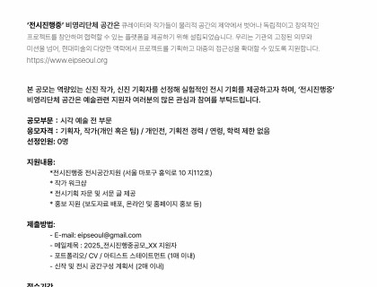 * 역량있는 신진 작가, 신진 기획자를 선정해 실험적인 전시 기회를 제공하고자 하며, ‘전시진행중’ 비영리단체 공간은 예술관련 지원자 여러분의 많은 관심과 참여를 부탁드립니다.공모부문:시각 예술 전 부문응모자격:기획자, 작가(개인 혹은 팀) / 개인전, 기획전 경력 / 연령, 학력 제한 없음선정인원: 0명지원내용:*전시진행중 전시공간지원 (서울 마포구 홍익로 10 지112호)* 작가 워크샵* 전시기획 자문 및 서문 글 제공* 홍보 지원 (보도자료 배포, 온라인 및 홈페이지 홍보 …