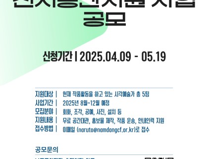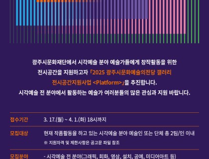(재)광주시문화재단은 시각예술 분야의 예술가를 발굴하고 전시공간을 지원하고자 ‘2025 광주시 문화예술의전당 갤러리 전시공간지원사업 ’을 추진하고 있습니다. 이에 다음과 같이 참여작가를 모집하오니 시각예술 분야 예술가 여러분들의 많은 관심과 참여 바랍니다.자세한 공고 내용은 광주시문화재단 홈페이지(https://www.nsart.or.kr/board/pnotice.do?act=read&bpoId=1202&bcaId=0&pageIndex=1)를 확인해주시기 바…