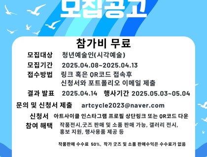 대상 : 국내외 활동중인 청년작가모집기간 : 25.04.08~25.04.13접수방법 : 신청서(인스타 프로필링크), 포트폴리오(자유)신청방법 : 이메일접수 artcycle2023@naver.com결과발표 : 4월14일 개별연락참여혜택 : 월미도 문화의거리 전시 및 갤러리전시, 행사용품, 홍보지원, 굿즈 및 매대 판매 100%제공 단 작품판매수수료 5 : 5문의 : 아트사이클 DM or artcycle2023@naver.com