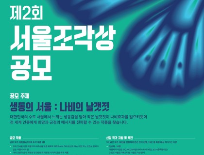 서울특별시는 조각가들의 실험적인 작품 활동 지원과 시민들의 일상 속 예술 경험 확장을 위해2025 조각도시서울 프로젝트의 일환으로 도심 문화공간 ‘뚝섬한강공원’에서2025 서울조각페스티벌 개최를 위한 제2회 서울조각상을 공모하오니역량 있는 작가들의 적극적인 관심과 참여 바랍니다.2025년 1월 22일서 울 특 별 시 장 ■공모 개요◦ 공모 명칭 : 제2회 서울조각상 ◦ 공모 주제 : 나비의 날갯짓대한민국의 수도 서울에서 느끼는 생동감을 담아 작은 날갯짓이 …