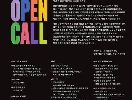 제25회 송은미술대상 (2025)(재)송은문화재단은 제 25회 송은미술대상 공모를 개최합니다.송은미술대상은 국내 유망한 젊은 미술작가들을 발굴하고 지원하기 위해 2001년 제정되어 매년 공모와 공정한 심사를 통해 수상자를 배출해왔습니다. 지난 2020년 미술상 제정 20주년을 맞이함과 동시에 신사옥 개관을 기념하여 2021년, 보다 작가들의 창작활동에 도움이 되는 미술상으로 거듭나고자 자격기준을 완하고, 수상 혜택을 확대하는 등 개편했습니다.송은미술대상은 실물작품 1점으로 채점되…