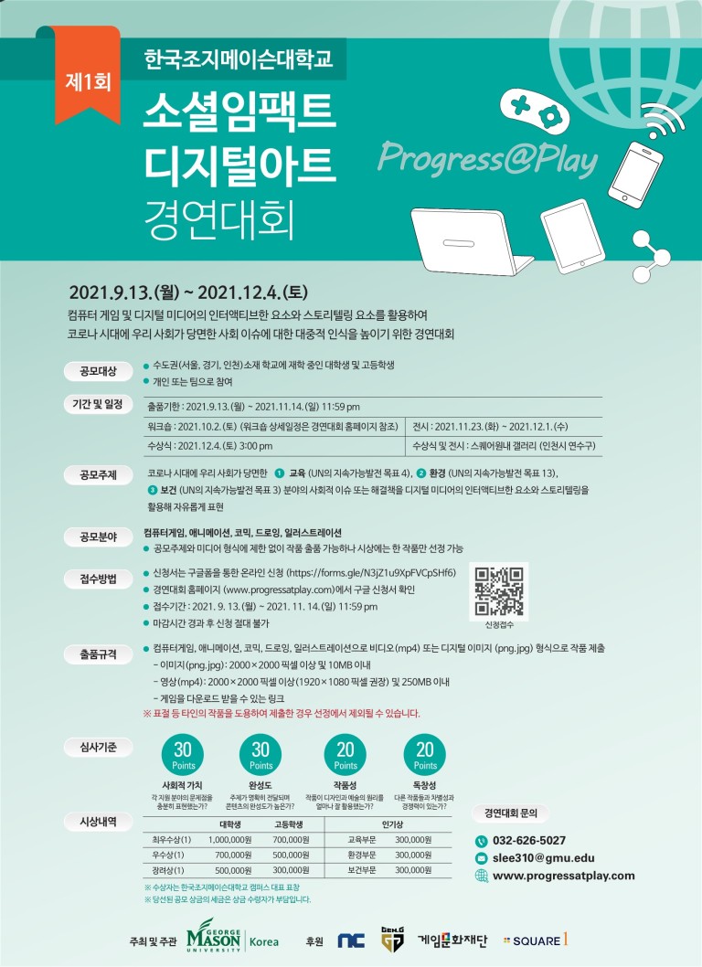 - 연락처 : 032-626-5027 한국조지메이슨대학교 대외협력팀 공모전 담당자