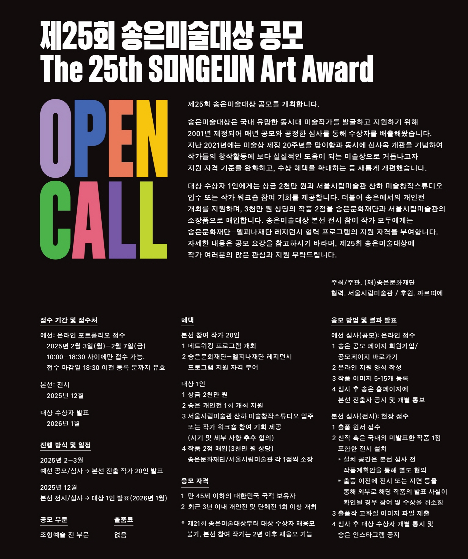 보다 자세한 내용은 하단의 혜택부문을 참고하시기 바라며, 제25회 송은미술대상에 작가 여러분의 많은 관심과 지원 부탁드립니다.
