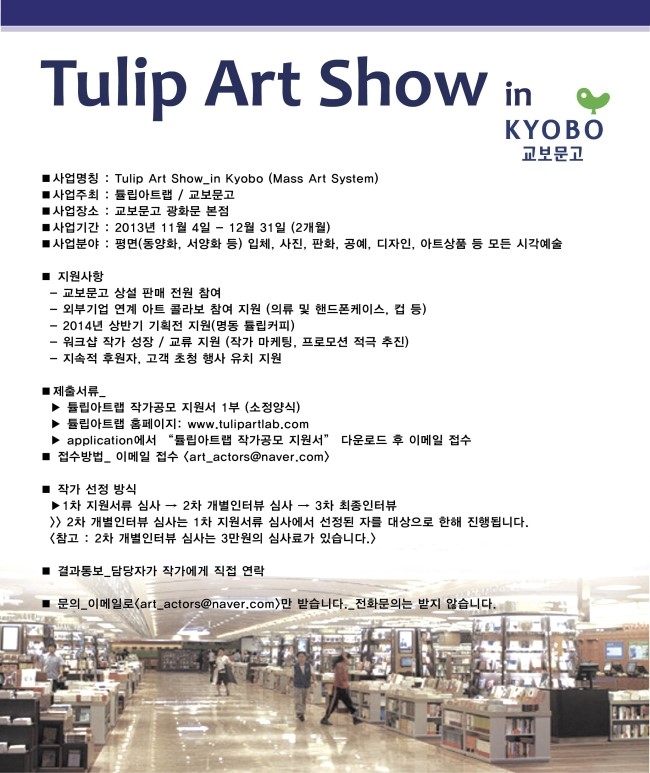 ◎ Tulip Art Show_in Kyobo는 국내 최초_최대로 시도되는 시각예술문화의 보편적 대중화시스템 형성 및 유통을 목적으로 합니다. 또한 일반 다수대중의 일상적 생활문화공간에서 진행되는 신개념 미술창작 컨텐츠 프렌차이즈형식 향유 보급형 시스템 브랜드입니다.