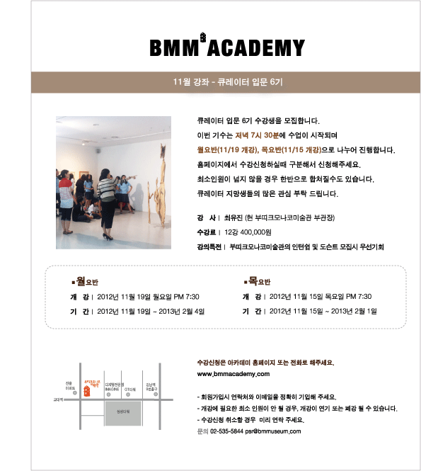 BMM 아카데미의 큐레이터 입문 과정은 스스로 전시를 기획하고자 하는 아티스트, 예비작가, 큐레이터를 꿈꾸는 학생, 직장인, 주부, 그리고 미술시장을 전반적으로 이해하고자 하는 모든이를 위한 강좌이다. 수강생은 교육과정을 이수한 후 각 분야의 전문가심사를 통해‘부띠크모나코미술관’에서 진행되는 전시뿐만 아니라 국내 미술관의 인턴 큐레이터 및 도슨트로 활동 할 수 있다.