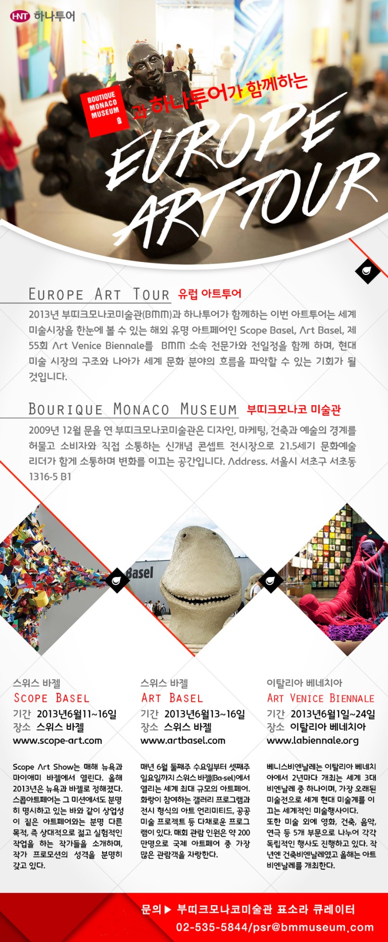 Scope Basel 2013은 상업성이 짙은 아트페어와는 달리 상대적으로 젊고 실험적인 작업을 하는 작가들을 소개하며는 프로모션의 성격을 분명히 갖고 있다. Art Basel 2013은 화랑이 참여하는 세계 최대 규모의 아트페어. 전시 형식의 아트 언리미티드, 공공미술 프로젝트 등 다채로운 프로그램이 있다. 55th Art Venice Biennale은 이탈리아 베네치아에서 2년마다 개최는 세계 3대 비엔날레 중 하나이며, 가장 오래된 미술전으로 세계 현대 미술계를 이끄는 세계적인 미술행사이다.
