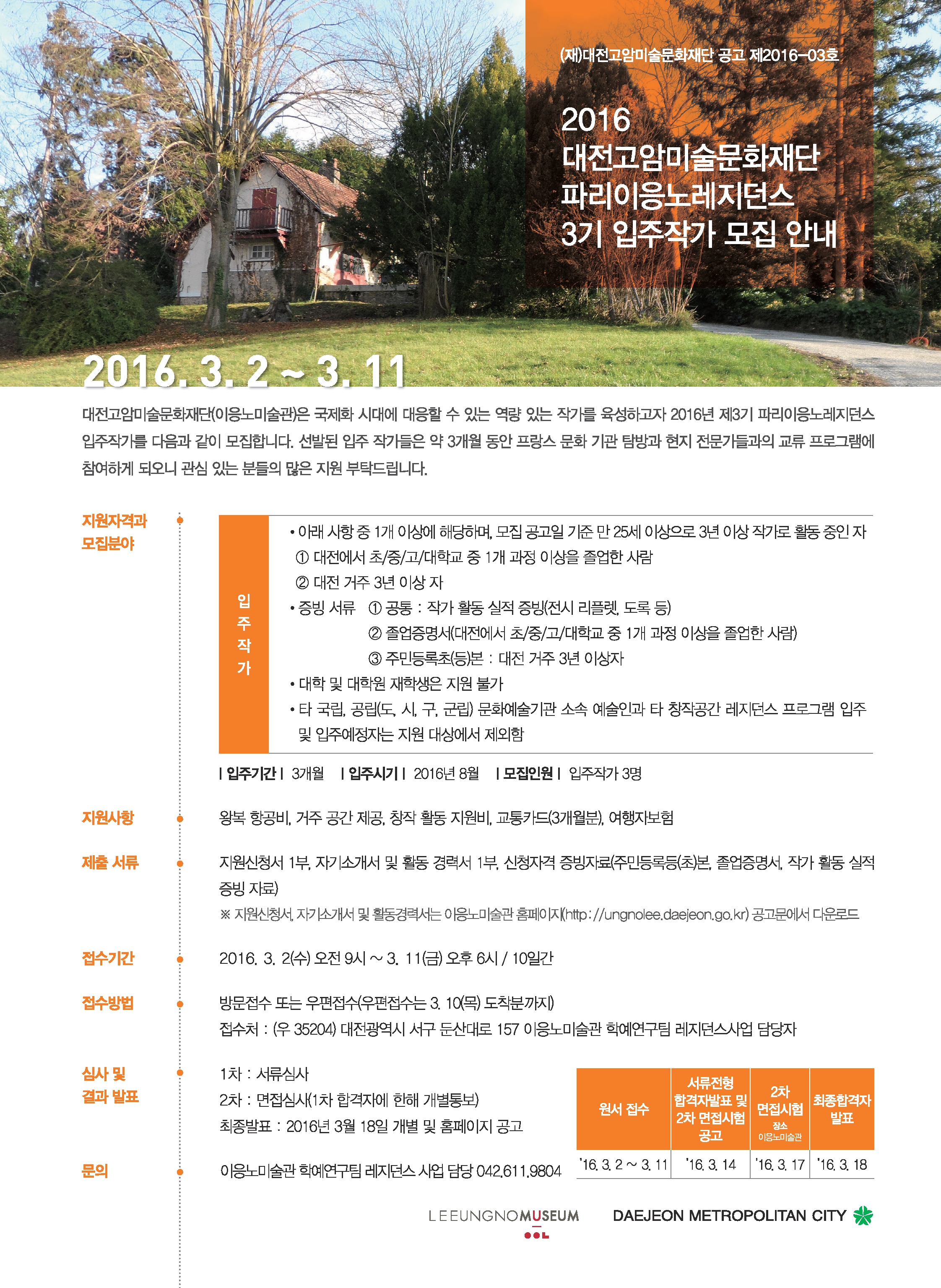 대전고암미술문화재단(이응노미술관)은 국제화 시대에 대응할 수 있는 역량 있는 작가를 육성하고자 2016년 제3기 파리이응노레지던스 입주작가를 다음과 같이 모집합니다. 선발된 입주 작가들은 약 3개월 동안 프랑스 문화 기관 탐방과 현지 전문가들과의 교류 프로그램에 참여하게 되오니 관심 있는 분들의 많은 지원 부탁드립니다.
