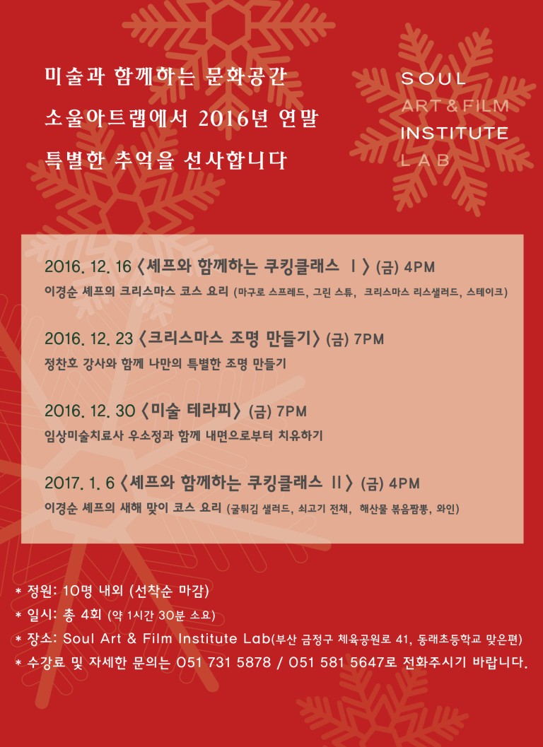 Soul Art & Film Institute Lab에서 준비한 특별한 클래스에 여러분들을 초대합니다 페이지 정보 작성자 워러도그 조회 6,614회 작성일 16-12-14 18:40 본문 연말연시를 맞이하여 소울아트스페이스. 구서동 에서는 다사다난했던 한해를 보내며 좀더 따뜻하게 힐링 할 수 있는 프로그램을 구성해 보았습니다 추천 0 목록 이전글 국내최초 2017글로벌 아트콜라보 엑스포로 초대합니다. 17.11.28 다음글 2016 인사미술공간 미술주간 프로그램 막간 幕間 Interlude 16.09.29