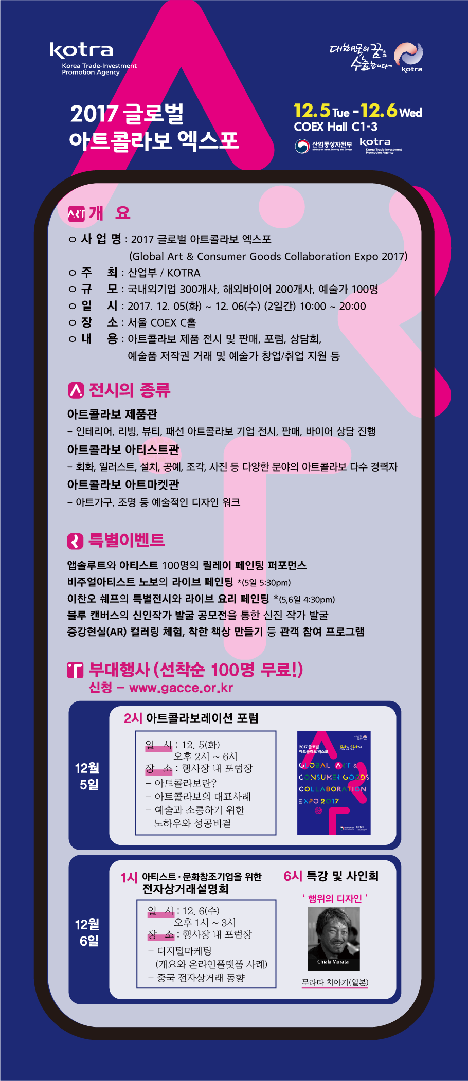 2017 글로벌 아트코라보 엑스포가 2017년 12월 5일 ~ 6일 COEX C홀에서 개최됩니다.