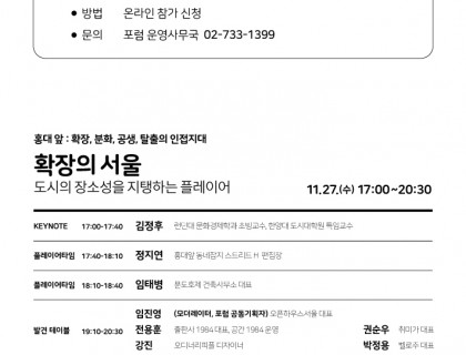 서울을 변화시키고, 확장시키고, 새롭게 바라보게 하는 도시 플레이어들의 사례를 공유하고, 그들이 견인하는 서울의 ‘도시 문화’ 트렌드를 조망합니다. ▸포럼주제 : ①확장의 서울/②이면의 서울/③오작동의 서울