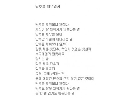 옷에 매달린 단추의 구멍 찾기 같은 것이야단추를 채워보니 알겠다단추도 잘못 채워지기 쉽다는 걸옷 한 벌 입기도 힘든다는 걸 추천 솔로탈출만들기 추천자료