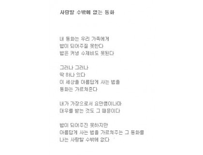 밥이 되어주진 못하지만 아름답게 사는 법을 가르쳐주는 그 동화를 나는 사랑할 수밖에 없다 화상채팅 어플 영상채팅 어플 random video chatting online 분당 자동차대출 중고차대출 사업자차대출 중고차 할부대출