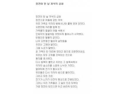전기가 나가기 전에 평소와 같이 진행되었습니다.그러나 우리 가족때때로 저는 권력에서 벗어나고 싶었습니다. 비디오채팅 추천 TV어플 비디오채팅 좋은곳 야플티비 성인방송 안드로이드 인기앱