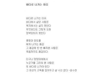 더구나 망망대해에서 누군가를 그리워 본 사람은 또 바다로 나가야 한다 그 최상의 고독을 접어두고 살 수는 없다 video random chat 추천링크 리워드 어플 백종원 음식 레시피 집밥 랜덤비디오채팅 랜덤화상채팅