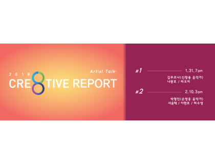 OCI미술관 창작스튜디오 입주작가전 아티스트 토크 2부가 진행됩니다. [2부]-일시: 2018년 2월 10일 (토) 오후 3시-참여작가: 박형진, 사윤택, 이현호, 허수영-장소: OCI미술관*토크에 앞서 박형진 작가 & 손영웅 작곡가의 협업 공연인 가 예정되어 있습니다. *온라인으로 사전 예약도 가능합니다.→ 2부 사전 신청하기 OCI미술관 창작스튜디오 입주작가전2018 Cre8tive Report김푸르나, 나광호, 라오미, 박형진, 사윤택, 이현호, 허수영, 周代焌2…