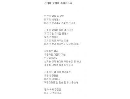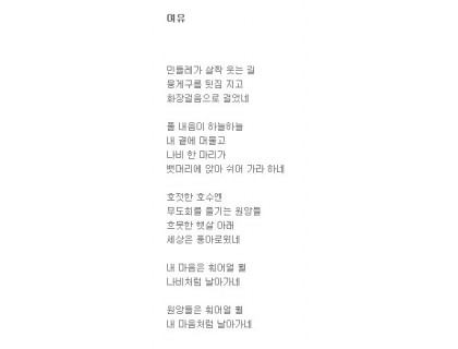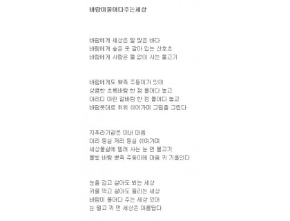 나 눈을 감고 살아도 뵈는 세상 우리 귀를 막고 살아도 들리는 세상 다시 바람이 물어다 주는 세상 있어 눈 멀고 귀 먼 세상은 아름답다 화상아자르