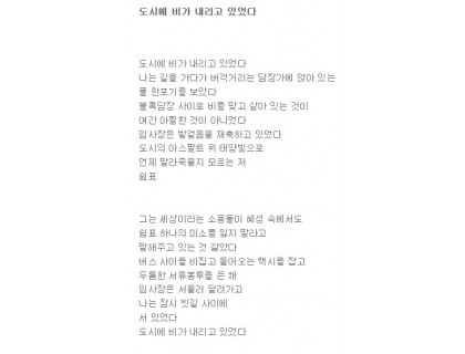 그사장은 서둘러 달려가고결국 나는 잠시 빗길 사이에 서 있었다 외로운 도시에 비가 내리고 있었다그리고...., 바로가기 링크2 [출처] 여친만들기카페
