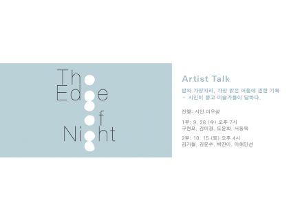 작가와의 대화밤의 가장자리, 가장 밝은 어둠에 관한 기록 – 시인이 묻고 미술가들이 답하다.진행: 이우성 시인 1부: 2016. 9. 28 (수) 오후 7시구현모, 김미경, 도윤희, 서동욱 2부: 2016. 10.15 (토) 오후 4시김기철, 김윤수, 박진아, 이해민선 → 사전 신청하러 가기 밤의 가장자리The Edge of Night구현모, 김기철, 김미경, 김윤수, 도윤희, 박진아, 서동욱, 이해민선 2016.9.1 – 10.22 OCI…