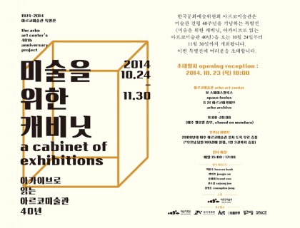 1974-2014 아르코미술관 특별전 미술을 위한 캐비닛, 아카이브로 읽는 아르코미술관 40년 2014.10.24-11.30 ■ 오프닝 리셉션 2014.10.23(THU), 6pm ■ 오프닝 이벤트 2014.10.23(THU), 6pm 2000년대 이후 아르코미술관 전시도록 무료증정 (※ 100권 한정, 도록 랜덤선별, 1인 3권까지) 아르코미술관 40주년 특별전, 미술을 위한 캐비닛, 아카이…