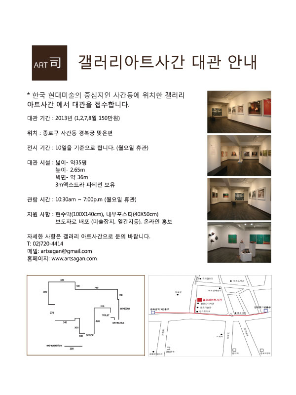 [대관안내]사간동에 위치한 갤러리아트사간 2013년 대관안내 페이지 정보 작성자 아트사간 조회 21,523회 작성일 12-12-22 13:41 본문 추천 0 목록 이전글 [EDA GALLERY] 2012 Muse in ART 12.12.26 다음글 2013 겨울방학 예술(창의성) 재능발견 및 힐링 아트캠프 12.12.13 아트사간님의 자유게시판 관련글 자유게시판 더보기 H 인기글 "The Photographs of FSA_People… 12-14 H 인기글 2013 신진 작가공모, 2013 작가 공모 갤러리 아… 11-17 H 인기글 얀 샤우덱 연계 이벤트 -사진특강과 음악회 08-23 H 인기글 얀샤우덱 전시보고 네모 인증샷을 찍으면 뮤지컬 위키드 … 08-18 H 인기글 배우 강필석과 함께하는 취미사진 이야기 08-18 H 인기글 2012 artsagan YAP작가공모 11-25