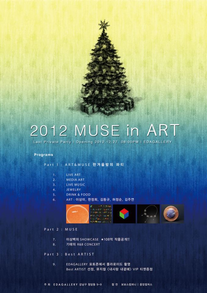 2012년 12월 27일 목요일 밤. EDA GALLERY는 저물어가는 한해를 회고하고, 다가오는 2013년을 새롭게 맞이하기 위하여 예술과 함께하는 한겨울밤의 파티 ‘MUSE in ART’ 가 열린다.