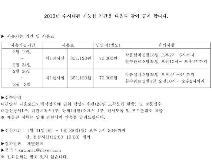 [수원미술전시관] 2013년도 수시대관 공고 페이지 정보 작성자 수원 조회 17,930회 작성일 13-01-24 17:09 본문 추천 0 첨부파일 2013_Form.zip 30.6K • 0회 다운로드 • 2013-01-24 17:09:04 관련링크 http://suwonartcenter.org/ 5181회 연결 목록 이전글 [아르코미술관]<@What : 신중국미술> 전시 심포지움/개막식에 초대합니다. 13.02.01 다음글 수원미술전시관 인턴십프로그램 참여자 4기 모집 13.01.23 수원님의 자유게시판 관련글 자유게시판 더보기 H 인기글 수원시 수원미술전시관 2014 가정의 달 특별기획전[W… 04-10 H 인기글 [수원시미술전시관] 2014년도 정기대관 신청 공고 11-09 H 인기글 [수원미술전시관] 자원활동가 모집 공고 11-07 H 인기글 [수원미술전시관 느리게 읽는 미술 책방] 책방 지킴이 … 11-07 H 인기글 수원미술전시관 <인턴십 교육 프로그램> 추가 교육생 모… 11-05 H 인기글 수원시 수원미술전시관 2014년도 정기 대관 신청 공고 10-29 H 인기글 [수원미술전시관] 자원활동가 모집 공고 10-24 H 인기글 [수원미술전시관] 자원활동가 모집 공고 10-03 H 인기글 [수원미술전시관 느리게 읽는 미술 책방] 책방 지킴이 … 10-03 H 인기글 경기도 수원시 수원미술전시관 <느리게 읽는 미술 책방>… 09-25