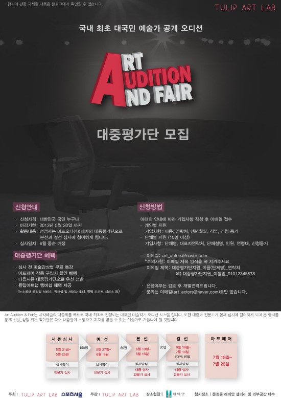 이번 "Art Audition & Fair 2013" 시즌 1은 (스포츠서울과 튤립아트랩이 공동주최) 시각예술의 대중화를 목표로 국내 최초로 진행되는 대국민 미술작가 오디션 시스템 입니다. 또한 대중과 전문가가 함께 심사에 참여하게 되며 본 행사를 통해 선발_성장 되는 작가들은 다수 대중들과 소통하고 지지를 받을 수 있는 예술가로 거듭나게 될 것입니다.