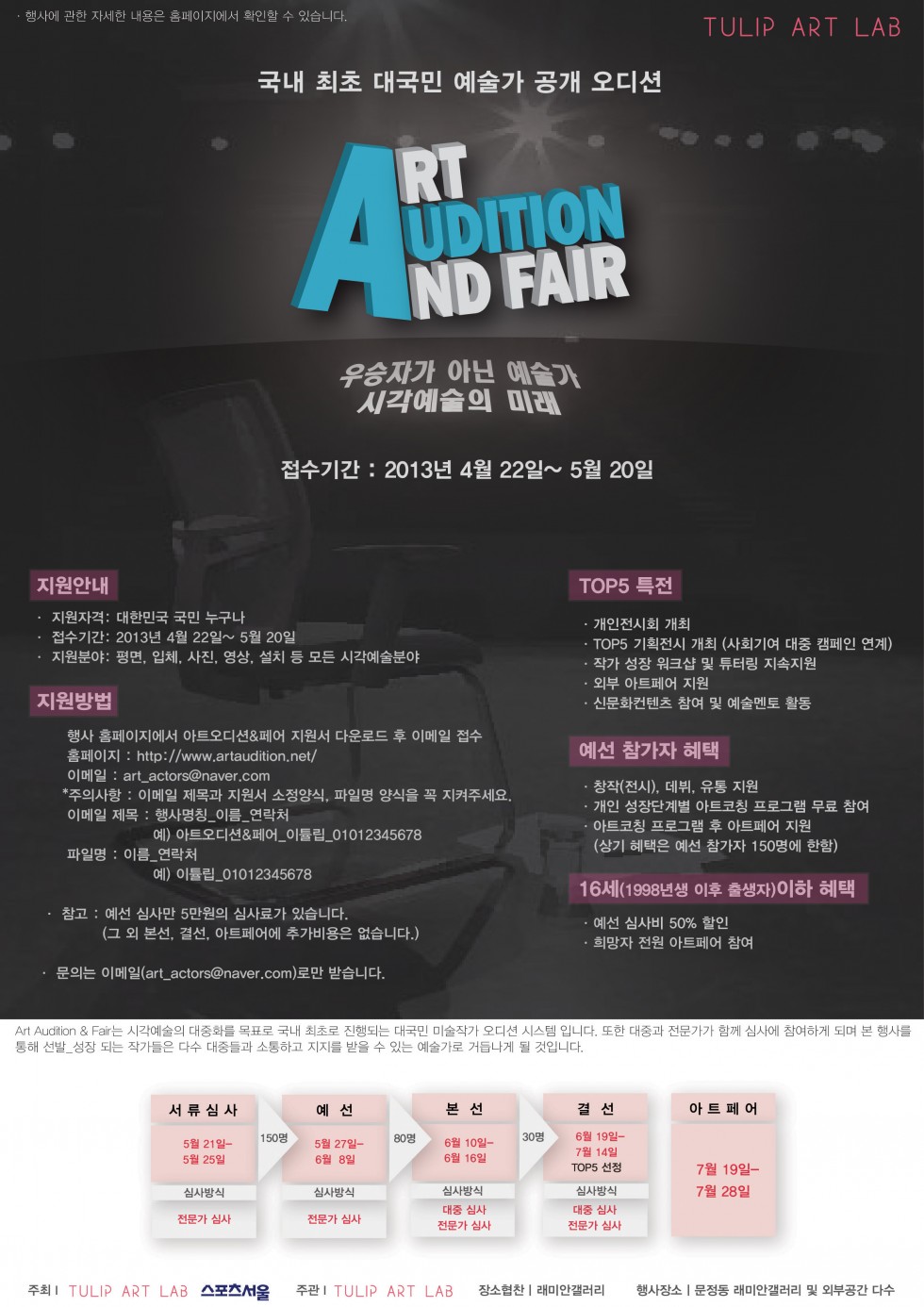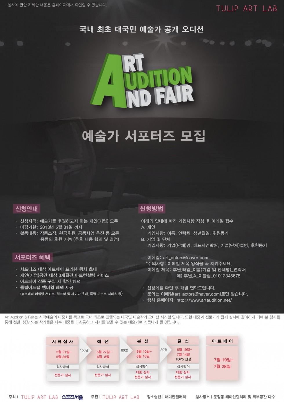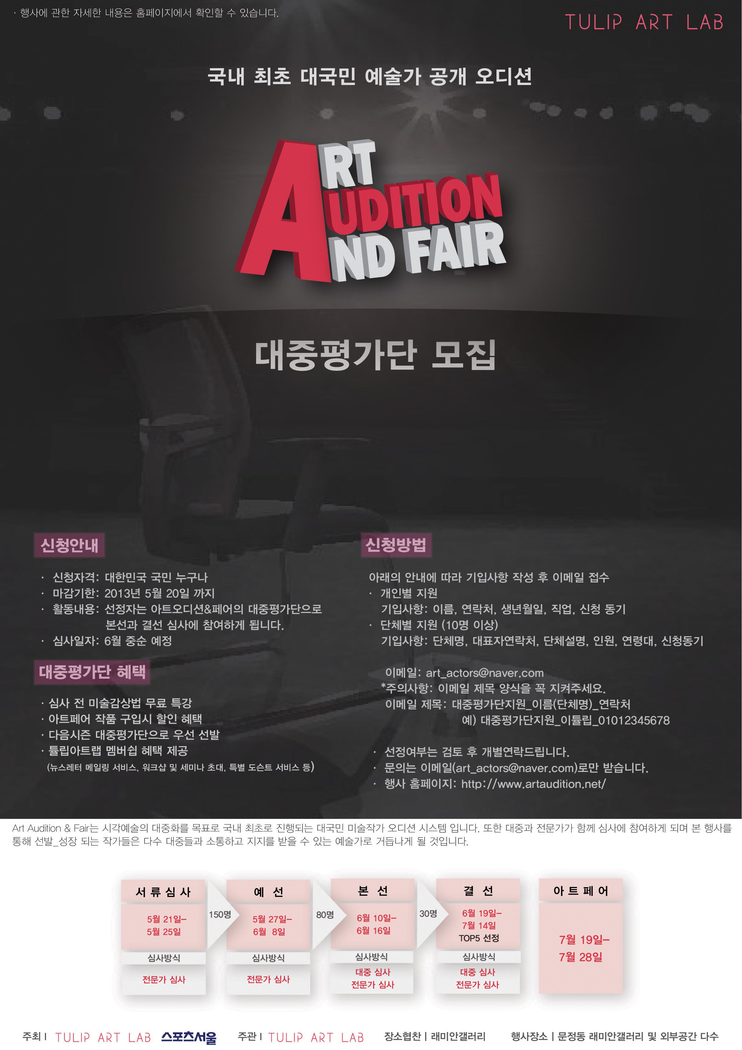 이번 "Art Audition & Fair 2013" 시즌 1은 (스포츠서울과 튤립아트랩이 공동주최) 시각예술의 대중화를 목표로 국내 최초로 진행되는 대국민 미술작가 오디션 시스템 입니다. 또한 대중과 전문가가 함께 심사에 참여하게 되며 본 행사를 통해 선발_성장 되는 작가들은 다수 대중들과 소통하고 지지를 받을 수 있는 예술가로 거듭나게 될 것입니다.