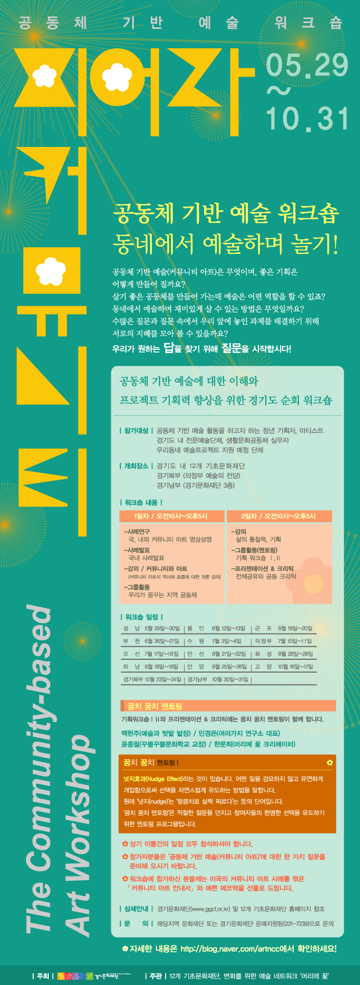공동체 기반 예술 워크숍 The Community-based Art Workshop 피어라 커뮤니티 페이지 정보 작성자 경기문화재단 조회 16,650회 작성일 14-07-04 15:33 본문 추천 0 목록 이전글 [송은아트스페이스] 페데리코 펠리니 영화 상영회 안내 14.07.05 다음글 [아르코미술관] 작가와의 대화_박흥용과 함께 하는 작화체험(7.5) 14.06.30