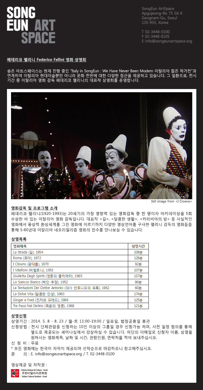 [송은아트스페이스] 페데리코 펠리니 영화 상영회 안내 페이지 정보 작성자 송은아트스페이스 조회 17,216회 작성일 14-07-05 17:54 본문 추천 0 목록 이전글 [2014 단원미술제 미술부문 작품공고] 14.07.15 다음글 공동체 기반 예술 워크숍 The Community-based Art Workshop 피어라 커뮤니티 14.07.04 송은아트스페이스님의 자유게시판 관련글 자유게시판 더보기 H 인기글 [송은 아트스페이스] “제18회 송은미술대상전” 단체관… 01-10 H 인기글 [송은 아트스페이스] 도슨트 자원봉사자 모집 ‘제17회… 11-21 H 인기글 [송은 아트큐브] 이병찬 개인전: 위장된 북어 9/15… 10-20 H 인기글 [송은 아트스페이스] 손동현: Jasmine Drago… 08-01 H 인기글 [송은 아트스페이스] 도슨트 자원봉사자 모집 “손동현:… 06-17 H 인기글 [송은 아트스페이스] 도슨트 자원봉사자 모집 “전소정 … 04-21 H 인기글 [송은 아트스페이스] 프랑스 지역자치단체 현대미술 컬렉… 03-22 H 인기글 [송은 아트스페이스] 도슨트 자원봉사자 모집 ‘What… 02-17 H 인기글 [송은 아트큐브] 류현민 개인전 : 완벽한 수평을 찾아… 12-10 H 인기글 [송은 아트스페이스] 톰 탄디오의 인도네시아 현대미술 … 10-12