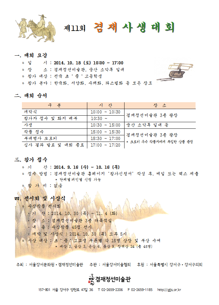 제11회 겸재사생대회 페이지 정보 작성자 장희선 조회 15,468회 작성일 14-08-24 16:05 본문 추천 0 첨부파일 제11회겸재사생대회요강.hwp 463.5K • 0회 다운로드 • 2014-08-24 16:05:05 제11회겸재사생대회참가신청서.hwp 822.0K • 0회 다운로드 • 2014-08-24 16:05:05 목록 이전글 [아트스페이스 정미소] Reality on the Reality 1부 8. 14 - 9. 14 14.08.28 다음글 [이응노미술관] 아카이브전 <서독으로 간 에트랑제, 이응노> 학술대회 개최 안내 14.08.22 장희선님의 자유게시판 관련글 자유게시판 더보기 H 인기글 [겸재정선미술관] 2018. 제9회 겸재 내일의 작가 … 07-07 H 인기글 [겸재정선미술관] 2017. 겸재랑 즐거운 어린이날 대… 04-16 H 인기글 [겸재정선미술관] 제14회 겸재 전국 사생대회 04-16 H 인기글 [겸재정선미술관] 2017. 제8회 겸재 학술논문현상공… 12-27 H 인기글 [겸재정선미술관] 2017. 제8회 겸재 내일의 작가 … 12-27 H 인기글 [겸재정선미술관] 2017. 겸재 미술관 극장 안내 12-21 H 인기글 [겸재정선미술관] 2017. 겸재 함께 공부하기 강좌 … 12-21 H 인기글 [겸재정선미술관] 2017. 명사석학 미술 인문학 강좌… 12-21 H 인기글 [겸재정선미술관] 제2기 겸재 홍보 서포터즈 활동단 모… 12-06 H 인기글 [겸재정선미술관] 2017. 학술논문현상공모 안내 08-02