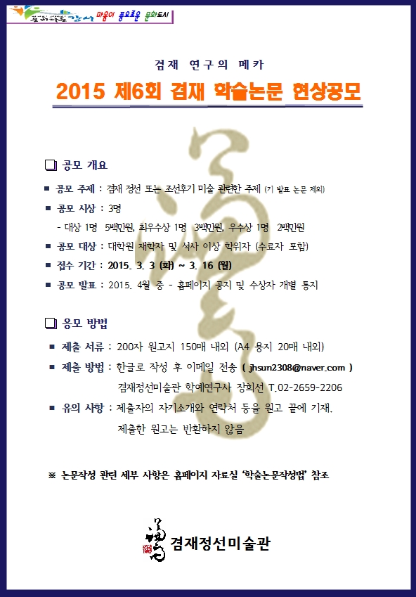 겸재정선미술관 2015년 제6회 겸재학술논문현상공모전 안내 페이지 정보 작성자 장희선 조회 19,794회 작성일 14-12-12 15:40 본문 많은 참여 바랍니다. 추천 0 목록 이전글 소울아트스페이스 개관9주년 < Memories of Nature >展 14.12.17 다음글 서울옥션 <ART&AUCTION> 대학생 아카데미 14.12.11 장희선님의 자유게시판 관련글 자유게시판 더보기 H 인기글 [겸재정선미술관] 2018. 제9회 겸재 내일의 작가 … 07-07 H 인기글 [겸재정선미술관] 2017. 겸재랑 즐거운 어린이날 대… 04-16 H 인기글 [겸재정선미술관] 제14회 겸재 전국 사생대회 04-16 H 인기글 [겸재정선미술관] 2017. 제8회 겸재 학술논문현상공… 12-27 H 인기글 [겸재정선미술관] 2017. 제8회 겸재 내일의 작가 … 12-27 H 인기글 [겸재정선미술관] 2017. 겸재 미술관 극장 안내 12-21 H 인기글 [겸재정선미술관] 2017. 겸재 함께 공부하기 강좌 … 12-21 H 인기글 [겸재정선미술관] 2017. 명사석학 미술 인문학 강좌… 12-21 H 인기글 [겸재정선미술관] 제2기 겸재 홍보 서포터즈 활동단 모… 12-06 H 인기글 [겸재정선미술관] 2017. 학술논문현상공모 안내 08-02