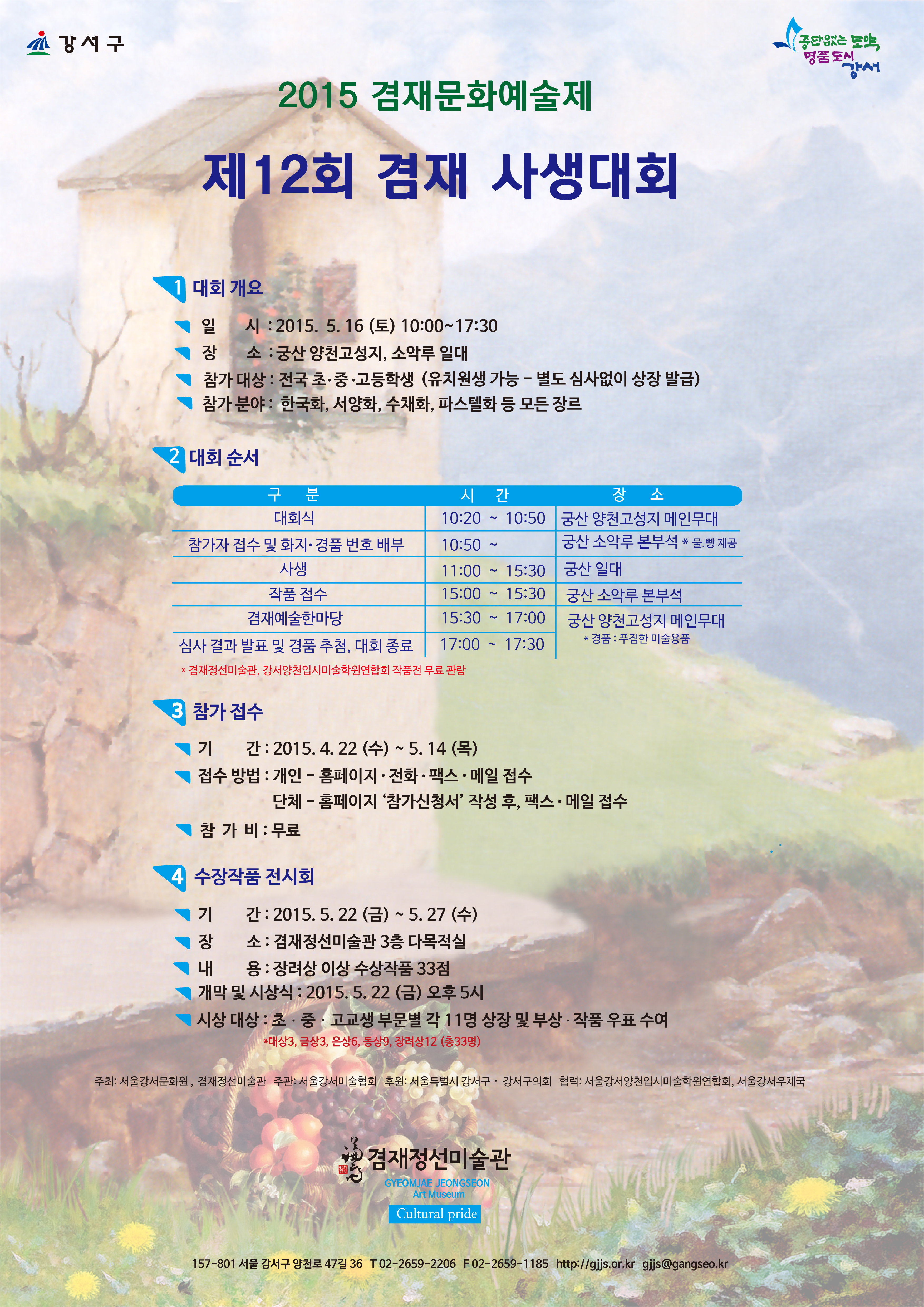 [겸재정선미술관] 제12회 겸재사생대회 개최(5.16토) 페이지 정보 작성자 장희선 조회 18,227회 작성일 15-04-22 10:29 본문 추천 0 첨부파일 제12회 겸재사생대회 요강.hwp 450.0K • 0회 다운로드 • 2015-04-22 10:29:56 제12회 겸재사생대회 단체참가신청서.hwp 144.5K • 0회 다운로드 • 2015-04-22 10:29:56 관련링크 http://gjjs.or.kr 4142회 연결 목록 이전글 2015. 모기동 예술 프로젝트 참여 작가 모집 공고 15.05.07 다음글 [송은아트스페이스] 크리스틴 아이 추 개인전: Perfect Imperfection_Artist Talk_4/29(수) 2PM 15.04.20 장희선님의 자유게시판 관련글 자유게시판 더보기 H 인기글 [겸재정선미술관] 2018. 제9회 겸재 내일의 작가 … 07-07 H 인기글 [겸재정선미술관] 2017. 겸재랑 즐거운 어린이날 대… 04-16 H 인기글 [겸재정선미술관] 제14회 겸재 전국 사생대회 04-16 H 인기글 [겸재정선미술관] 2017. 제8회 겸재 학술논문현상공… 12-27 H 인기글 [겸재정선미술관] 2017. 제8회 겸재 내일의 작가 … 12-27 H 인기글 [겸재정선미술관] 2017. 겸재 미술관 극장 안내 12-21 H 인기글 [겸재정선미술관] 2017. 겸재 함께 공부하기 강좌 … 12-21 H 인기글 [겸재정선미술관] 2017. 명사석학 미술 인문학 강좌… 12-21 H 인기글 [겸재정선미술관] 제2기 겸재 홍보 서포터즈 활동단 모… 12-06 H 인기글 [겸재정선미술관] 2017. 학술논문현상공모 안내 08-02