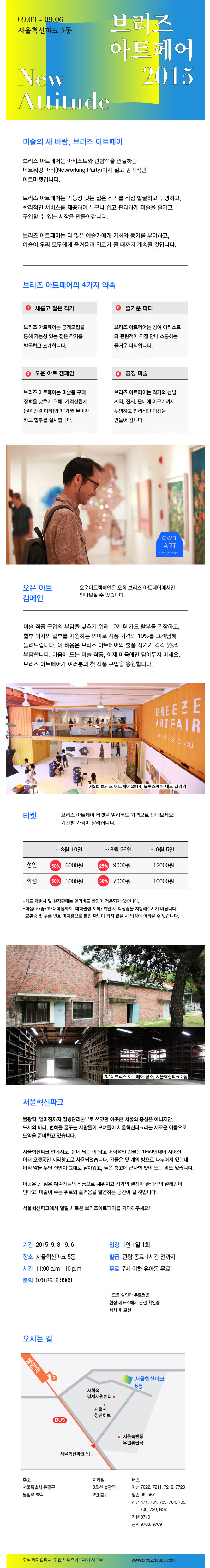 <예술에 대한 새로운 태도, 2015 브리즈 아트페어> 얼리버드 티켓오픈 페이지 정보 작성자 에이컴퍼니 조회 17,790회 작성일 15-08-10 19:22 본문 ▼ 인터파크 티켓링크http://ticket.interpark.com/Ticket/Goods/GoodsInfo.asp?GoodsCode=15008377 추천 0 목록 이전글 [송은 아트스페이스] Summer Love : 송은 아트큐브 그룹전 2부_오프닝_8월 19일 오후 6시 15.08.13 다음글 [송은 아트스페이스] Summer Love : 송은 아트큐브 그룹전 15.07.30