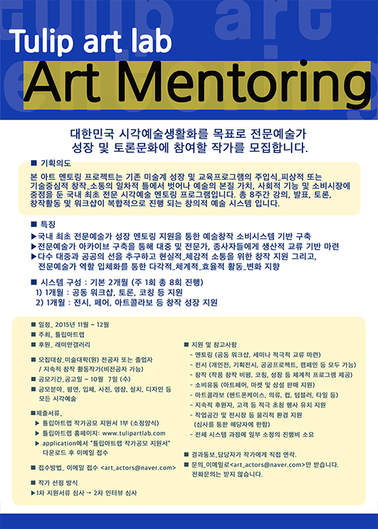 본 아트 멘토링 프로젝트는 기존 미술계 성장 및 교육프로그램의 주입식_피상적 또는 기술중심적 창작_소통의 일차적 틀에서 벗어나 예술의 본질 가치, 사회적 기능 및 소비시장에 중점을 둔 국내 최초 전문 시각예술 멘토링 프로그램입니다. 총 8주간 강의, 발표, 토론, 창작활동 및 워크샵이 복합적으로 진행 되는 창의적 예술 시스템 입니다.