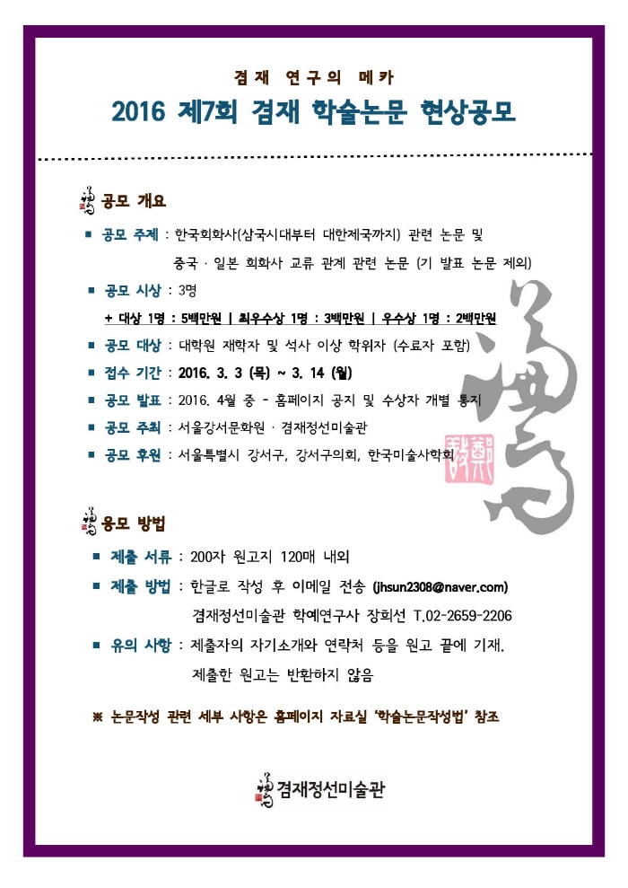 [겸재정선미술관] 2016 학술논문공모 안내 페이지 정보 작성자 장희선 조회 18,235회 작성일 16-01-10 11:33 본문 자세한 사항은 미술관 홈페이지 공지사항(http://gjjs.or.kr) 확인 바라며, 많은 참여 부탁드립니다. 감사합니다. 문의: T. 02-2659-2206~7 추천 0 목록 이전글 갤러리이배>Feast of EditionⅡ전 16.01.21 다음글 제15회 송은미술대상전_Artists Talk_2016/1/8(금) 2PM 15.12.30 장희선님의 자유게시판 관련글 자유게시판 더보기 H 인기글 [겸재정선미술관] 2018. 제9회 겸재 내일의 작가 … 07-07 H 인기글 [겸재정선미술관] 2017. 겸재랑 즐거운 어린이날 대… 04-16 H 인기글 [겸재정선미술관] 제14회 겸재 전국 사생대회 04-16 H 인기글 [겸재정선미술관] 2017. 제8회 겸재 학술논문현상공… 12-27 H 인기글 [겸재정선미술관] 2017. 제8회 겸재 내일의 작가 … 12-27 H 인기글 [겸재정선미술관] 2017. 겸재 미술관 극장 안내 12-21 H 인기글 [겸재정선미술관] 2017. 겸재 함께 공부하기 강좌 … 12-21 H 인기글 [겸재정선미술관] 2017. 명사석학 미술 인문학 강좌… 12-21 H 인기글 [겸재정선미술관] 제2기 겸재 홍보 서포터즈 활동단 모… 12-06 H 인기글 [겸재정선미술관] 2017. 학술논문현상공모 안내 08-02