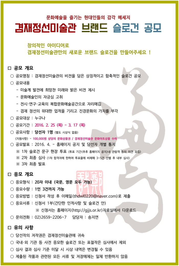 [겸재정선미술관] 브랜드 슬로건 공모 안내 페이지 정보 작성자 장희선 조회 21,760회 작성일 16-02-24 16:01 본문 자세한 사항은 미술관 홈페이지 공지사항(http://gjjs.or.kr) 확인 바라며, 많은 참여 부탁드립니다. 감사합니다. 문의: T. 02-2659-2206~7 추천 0 목록 이전글 [백남준아트센터] 백남준 추모 10주기 특별전 <다중시간> 개막 행사 및 아티스트 토크 안내 16.02.25 다음글 전시연계 워크숍 <1분 아카이브> 16.02.12 장희선님의 자유게시판 관련글 자유게시판 더보기 H 인기글 [겸재정선미술관] 2018. 제9회 겸재 내일의 작가 … 07-07 H 인기글 [겸재정선미술관] 2017. 겸재랑 즐거운 어린이날 대… 04-16 H 인기글 [겸재정선미술관] 제14회 겸재 전국 사생대회 04-16 H 인기글 [겸재정선미술관] 2017. 제8회 겸재 학술논문현상공… 12-27 H 인기글 [겸재정선미술관] 2017. 제8회 겸재 내일의 작가 … 12-27 H 인기글 [겸재정선미술관] 2017. 겸재 미술관 극장 안내 12-21 H 인기글 [겸재정선미술관] 2017. 겸재 함께 공부하기 강좌 … 12-21 H 인기글 [겸재정선미술관] 2017. 명사석학 미술 인문학 강좌… 12-21 H 인기글 [겸재정선미술관] 제2기 겸재 홍보 서포터즈 활동단 모… 12-06 H 인기글 [겸재정선미술관] 2017. 학술논문현상공모 안내 08-02