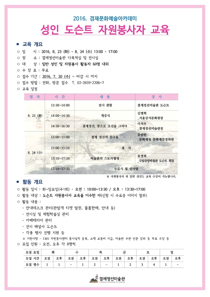 겸재정선미술관의 자원봉사자로 활동을 희망하시는 분들은