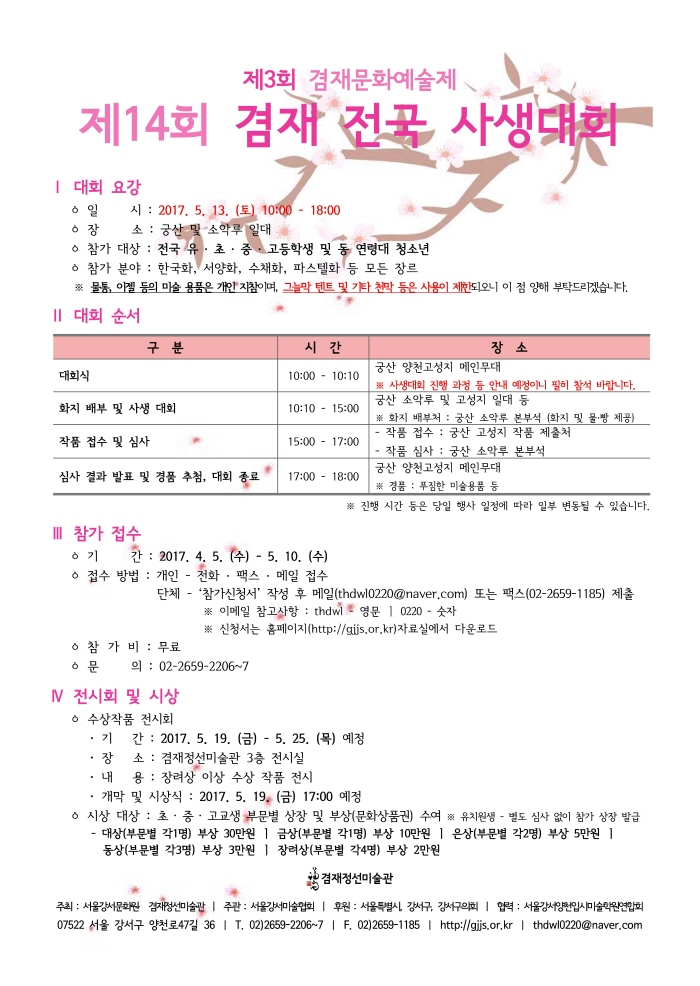 [겸재정선미술관] 제14회 겸재 전국 사생대회 페이지 정보 작성자 장희선 조회 23,226회 작성일 17-04-16 13:32 본문 ※ 자세한 사항은 미술관 홈페이지 공지사항(http://gjjs.or.kr) 확인 바라며, 많은 참여 부탁드립니다. 감사합니다. 추천 0 목록 이전글 [겸재정선미술관] 2017. 겸재랑 즐거운 어린이날 대잔치 17.04.16 다음글 [아트스페이스와트] 와트서포터즈 : WATT SUPPORTERS 17.04.06 장희선님의 자유게시판 관련글 자유게시판 더보기 H 인기글 [겸재정선미술관] 2018. 제9회 겸재 내일의 작가 … 07-07 H 인기글 [겸재정선미술관] 2017. 겸재랑 즐거운 어린이날 대… 04-16 H 인기글 [겸재정선미술관] 2017. 제8회 겸재 학술논문현상공… 12-27 H 인기글 [겸재정선미술관] 2017. 제8회 겸재 내일의 작가 … 12-27 H 인기글 [겸재정선미술관] 2017. 겸재 미술관 극장 안내 12-21 H 인기글 [겸재정선미술관] 2017. 겸재 함께 공부하기 강좌 … 12-21 H 인기글 [겸재정선미술관] 2017. 명사석학 미술 인문학 강좌… 12-21 H 인기글 [겸재정선미술관] 제2기 겸재 홍보 서포터즈 활동단 모… 12-06 H 인기글 [겸재정선미술관] 2017. 학술논문현상공모 안내 08-02 H 인기글 [겸재정선미술관] 2017. 내일의 작가 공모 안내 08-02