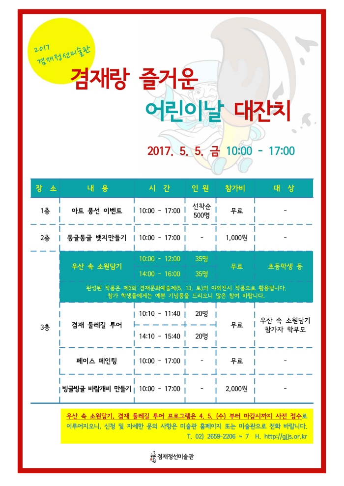 [겸재정선미술관] 2017. 겸재랑 즐거운 어린이날 대잔치 페이지 정보 작성자 장희선 조회 23,106회 작성일 17-04-16 13:33 본문 ※ 자세한 사항은 미술관 홈페이지 공지사항(http://gjjs.or.kr) 확인 바라며, 많은 참여 부탁드립니다. 감사합니다. 추천 0 목록 이전글 [백남준아트센터] 상상적 아시아 17.04.21 다음글 [겸재정선미술관] 제14회 겸재 전국 사생대회 17.04.16 장희선님의 자유게시판 관련글 자유게시판 더보기 H 인기글 [겸재정선미술관] 2018. 제9회 겸재 내일의 작가 … 07-07 H 인기글 [겸재정선미술관] 제14회 겸재 전국 사생대회 04-16 H 인기글 [겸재정선미술관] 2017. 제8회 겸재 학술논문현상공… 12-27 H 인기글 [겸재정선미술관] 2017. 제8회 겸재 내일의 작가 … 12-27 H 인기글 [겸재정선미술관] 2017. 겸재 미술관 극장 안내 12-21 H 인기글 [겸재정선미술관] 2017. 겸재 함께 공부하기 강좌 … 12-21 H 인기글 [겸재정선미술관] 2017. 명사석학 미술 인문학 강좌… 12-21 H 인기글 [겸재정선미술관] 제2기 겸재 홍보 서포터즈 활동단 모… 12-06 H 인기글 [겸재정선미술관] 2017. 학술논문현상공모 안내 08-02 H 인기글 [겸재정선미술관] 2017. 내일의 작가 공모 안내 08-02