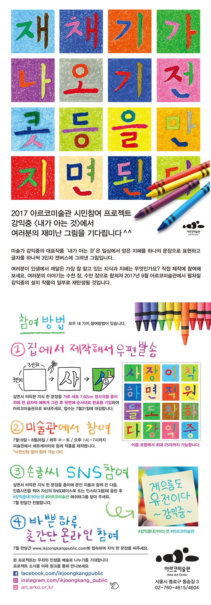 [아르코미술관] 강익중 <내가 아는 것> 시민참여 안내 페이지 정보 작성자 아르코미술관 조회 23,408회 작성일 17-06-27 11:52 본문 추천 0 목록 이전글 [아트캠페인 2017 아트경기] 참여 작가 및 갤러리 공모 17.07.01 다음글 [송은 아트스페이스] 도슨트 자원봉사자 모집 “손동현: Jasmine Dragon Phoenix Pearl” 17.06.17 아르코미술관님의 자유게시판 관련글 자유게시판 더보기 H 인기글 [아르코미술관] 라익스아카데미 레지던시 교류특별전《관계… 03-25 H 인기글 전시연계 워크숍 <1분 아카이브> 02-12 H 인기글 2015 아르코미술관 융복합 기획전 <작가를 찾는 8인… 08-27 H 인기글 2015 아르코미술관 융복합 기획전 <작가를 찾는 8인… 07-13 H 인기글 [아르코미술관] 니나 카넬 개인전 <새틴 이온 Sati… 05-26 H 인기글 [아르코미술관] 남화연 개인전 <시간의 기술 Time … 05-26 H 인기글 <한반도 오감도> 제14회 베니스 비엔날레 국제건축전 … 03-05 H 인기글 [아르코미술관] 협력기획전 <즐거운 나의 집>이 개최됩… 12-05 H 인기글 [아르코미술관] 아르코미디어 비평 총서 출간 기념 세미… 11-14 H 인기글 [아르코미술관] <역병의 해 일지> 전시 연계 프로그램 10-31