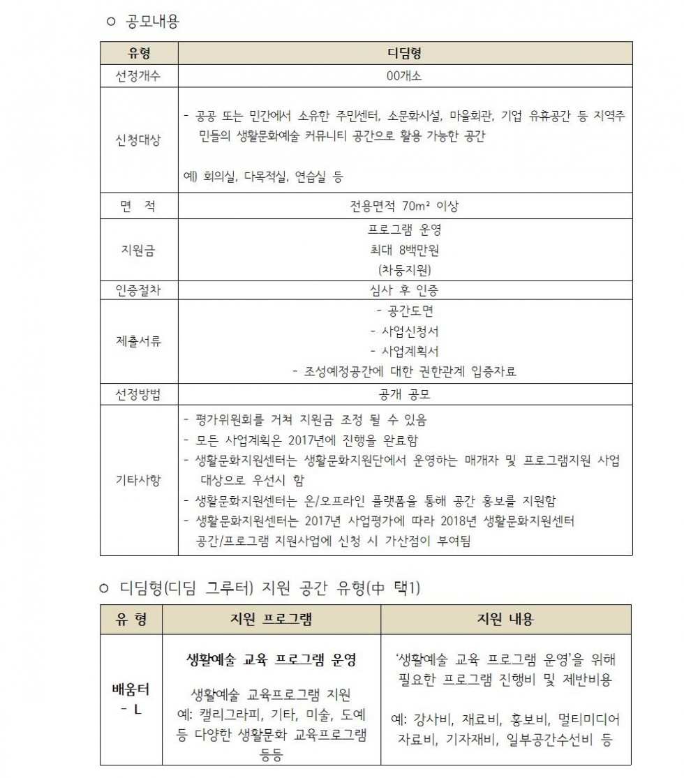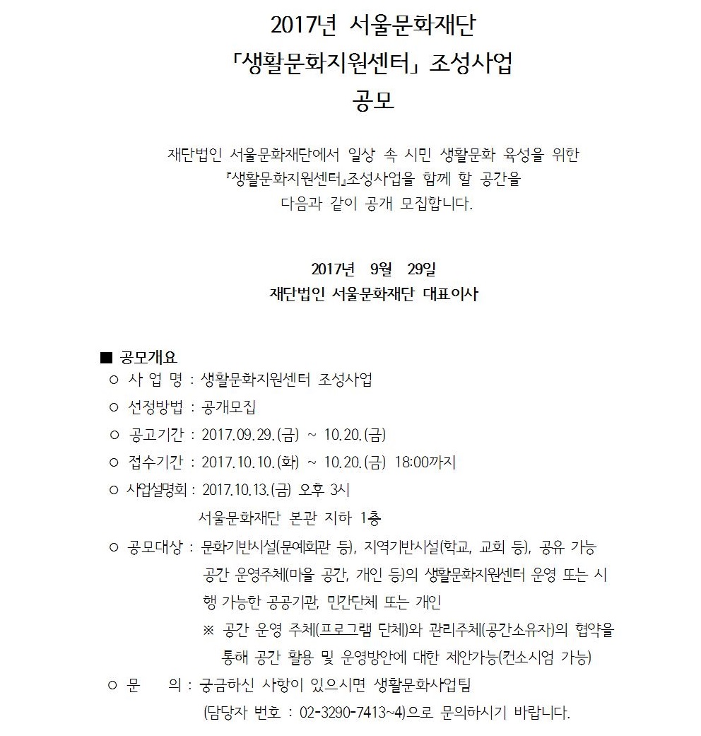 [공모]서울문화재단 생활문화지원센터 조성 사업 2차 공모 페이지 정보 작성자 이다영 조회 20,011회 작성일 17-10-11 15:29 본문 ■ 자세한 내용은 첨부파일을 참조해주시기 바랍니다. ■ 서울문화재단 링크http://www.sfac.or.kr/html/opensquare/notice.asp?SearchCategory=&SearchYear=&SearchKey=&SearchValue=&SearchStart=&SearchFinal=&perMenuSeq=6&MenuSeq=108&flag=READ&Page=2&Seq=46775 추천 0 첨부파일 생활문화지원센터 조성 사업 2차 공모.zip 56.8K • 0회 다운로드 • 2017-10-11 15:29:21 목록 이전글 [한국학중앙연구원 한국학대학원 2018년도 신입생 모집공고] 17.10.19 다음글 2017 글로벌 아트콜라보 엑스포 참가 예술인 모집 17.09.27