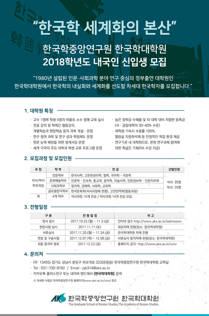 [한국학중앙연구원 한국학대학원 2018년도 신입생 모집공고]