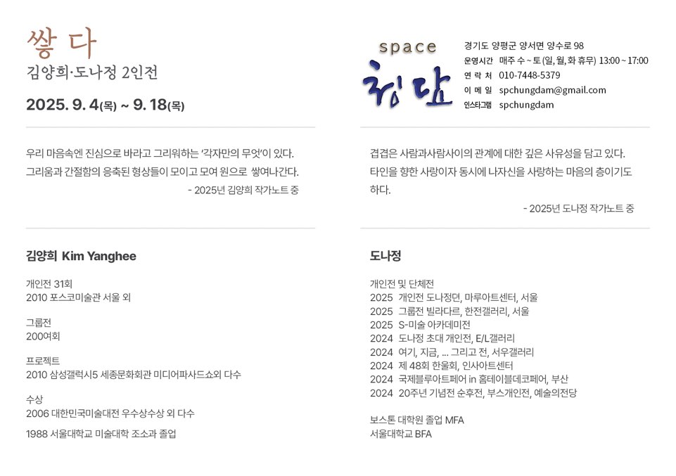 김양희와 도나정은 각각 다른 시각과 언어로 ‘쌓다’라는 주제를 풀어가지만, 그들이 표현하는 관계와 자아의 여정은 결국 공통된 질문에 대한 답을 찾으려는 시도입니다.