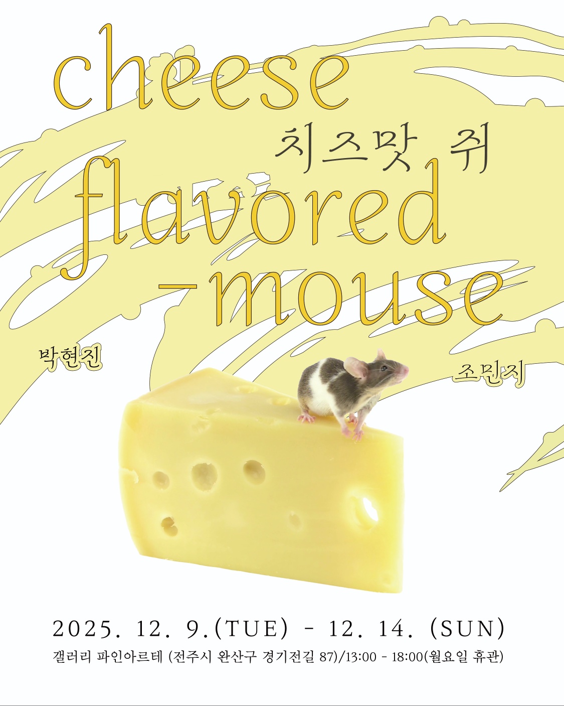 두 사람의 작업은 속도도 다르고, 시간을 다루는 태도도 전혀 다르지만, 그 차이 때문에 오히려 두 시간의 흐름은 충돌하고 겹쳐지며 새로운 결을 만든다. 마치 발효의 느린 시간과 고양이의 돌발적 개입이 만나 ‘치즈맛 쥐’라는 제3의 결과를 만들어낸 것처럼, 전시는 두 작가의 조형적 시간성이 엇갈리고 맞물리며 만들어내는 변화를 드러낸다.
