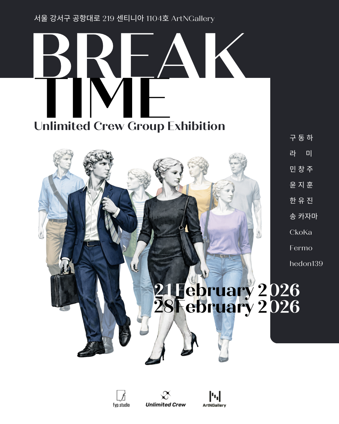 Break Time은 거창한 휴식이 아닌, 일상 속에서 잠시 허락되는 짧은 틈과 같은 전시다. 이 공간에서만큼은 효율과 생산성에서 벗어나, 예술을 통해 온전히 자신에게 집중하는 시간이 되기를 바란다.